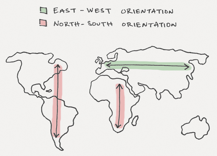 According to Jared Diamond’s book - Guns, Germs, and Steel - the different shape of continents - latitudinal and longitudinal axes - had a profound impact on human behavior and how agriculture spread over the centuries.